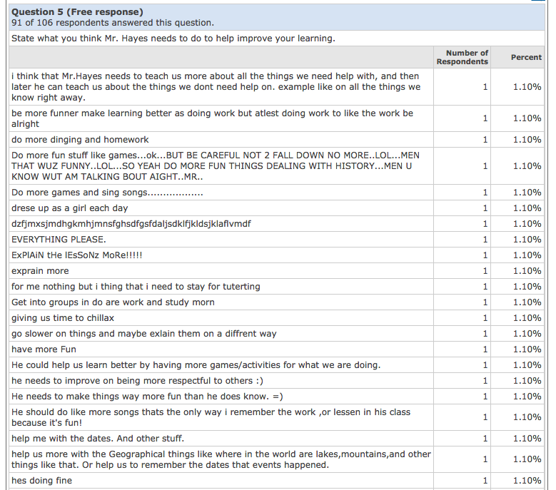 An anonymous Quia survey from my 8th-grade history class in October 2008 directly asking my students what I need to improve.